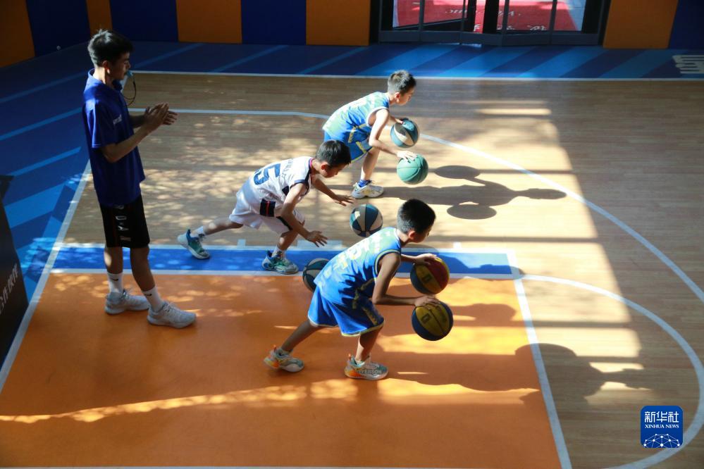 7月17日,在山東省高密市一籃球訓練營,孩子們在進行籃球基本功訓練。