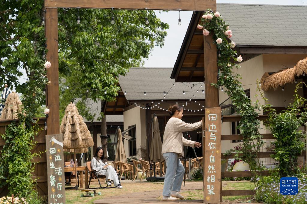 成都市天府新區(qū)官塘村一家田園餐廳的店主(右)打開店門(4月25日攝)。