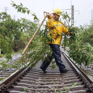 7月18日,國鐵南寧局沿海鐵路公司職工在西部陸海新通道鐵路沿線處理危竹危樹。當日,國鐵南寧局沿海鐵路公司組織職工利用軌道車,在風雨中對西部陸海新通道鐵路沿線進行巡檢,對線路和防洪重點處所進行全面巡查,及時處理危竹危樹、接觸網設備隱患等問題,全力確保鐵路運行安全。
