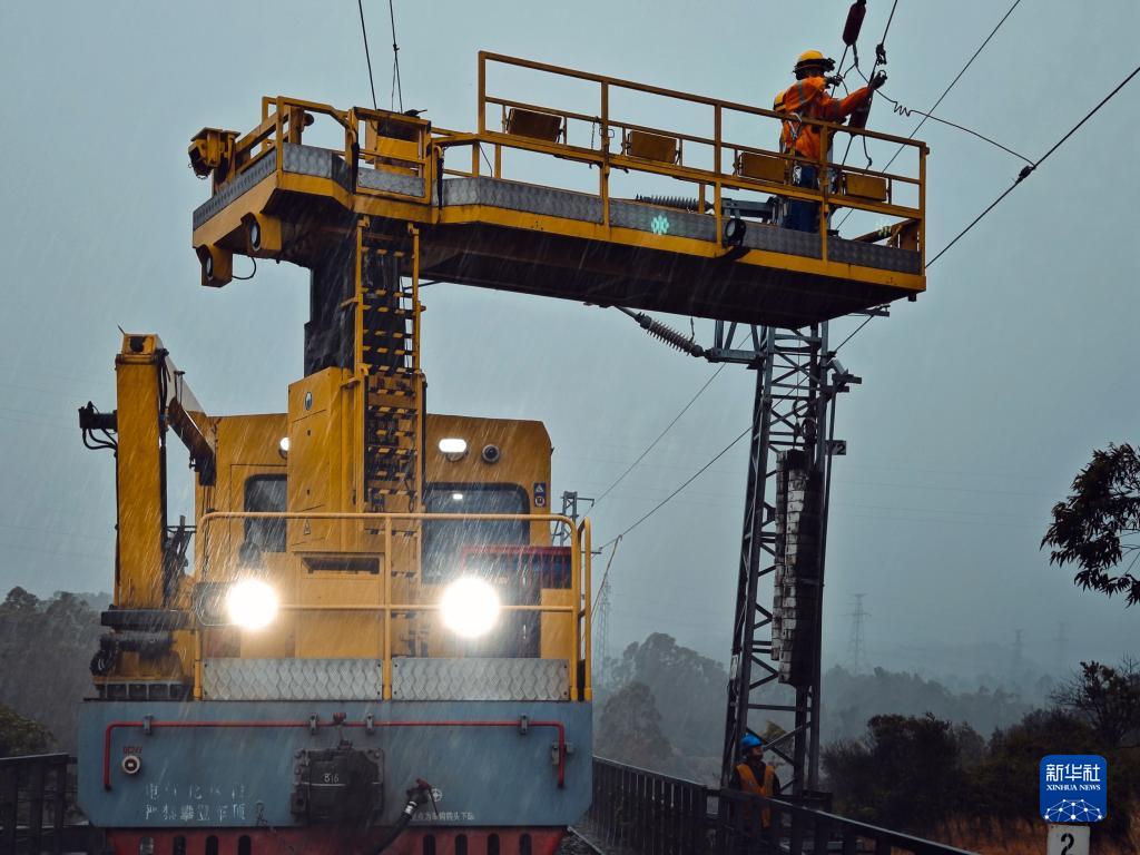 7月18日,國(guó)鐵南寧局沿海鐵路公司職工在排查接觸網(wǎng)。當(dāng)日,國(guó)鐵南寧局沿海鐵路公司組織職工利用軌道車(chē),在風(fēng)雨中對(duì)西部陸海新通道鐵路沿線(xiàn)進(jìn)行巡檢,對(duì)線(xiàn)路和防洪重點(diǎn)處所進(jìn)行全面巡查,及時(shí)處理危竹危樹(shù)、接觸網(wǎng)設(shè)備隱患等問(wèn)題,全力確保鐵路運(yùn)行安全。