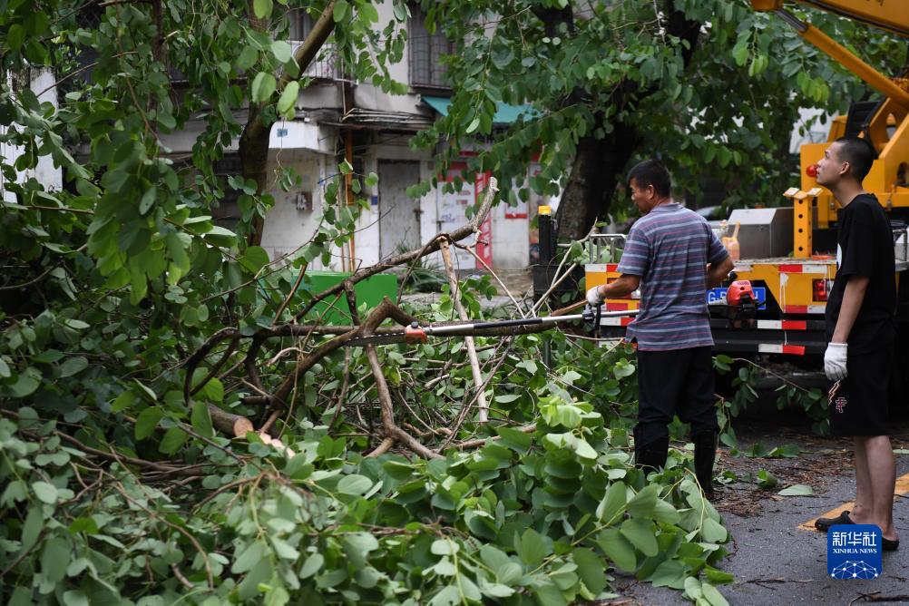 7月18日,在廣東湛江市海園路,市政人員在清理倒伏樹木。
