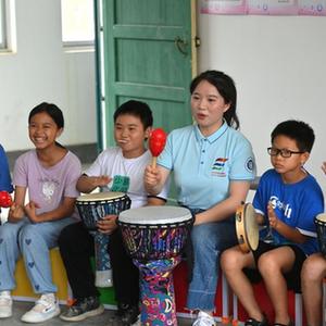 7月18日,在柳州市融安縣泗頂鎮中心小學,大學生在音樂課堂上給小學生上課。