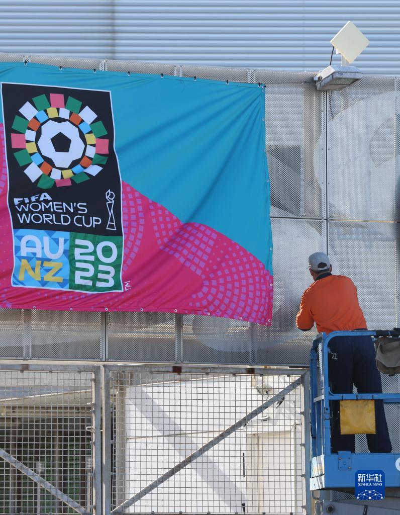 7月17日,在新西蘭首都惠靈頓,一名工人在張貼2023年國際足聯女足世界杯海報。