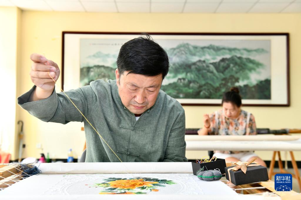 7月19日,在威海市文登區魯繡非遺工坊,非遺傳承人田世科在繡制魯繡作品。