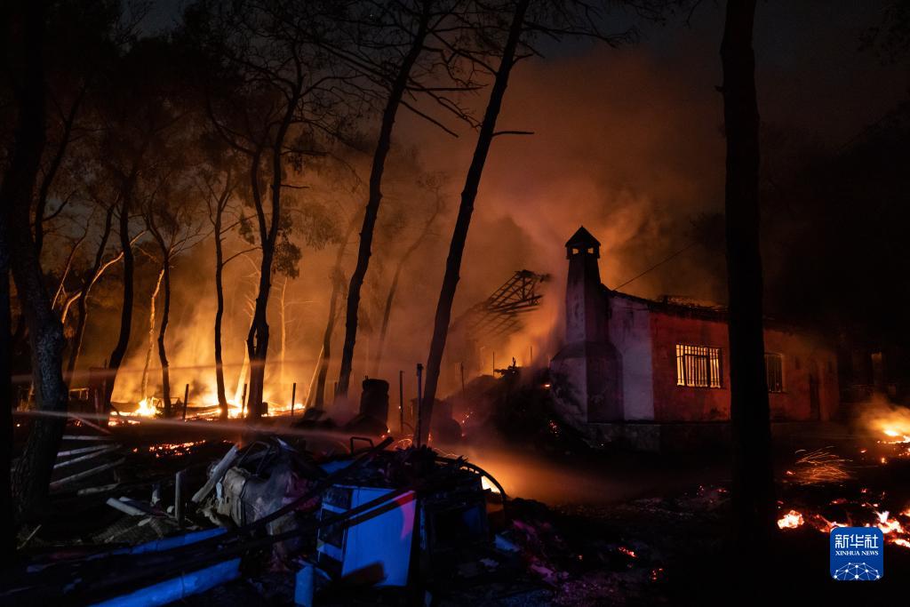 7月18日,在希臘雅典郊外的曼茲拉附近,消防員和志愿者進行滅火作業。
