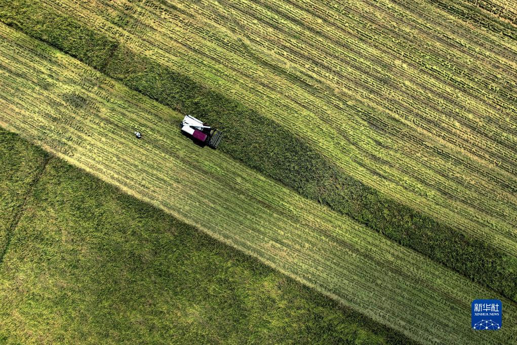 在福建省福州市長樂區古槐鎮洋下村春欽農業專業合作社稻田,農民駕駛農機收割早稻(7月19日攝,無人機照片)。