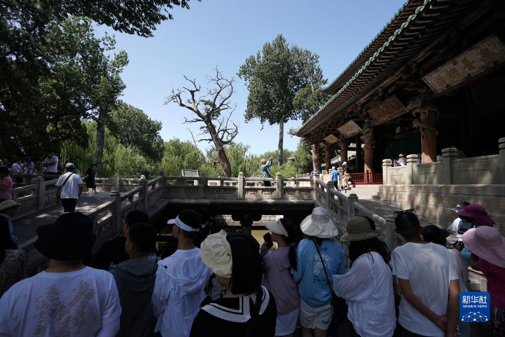 游客在晉祠圣母殿前觀看十字形古橋魚沼飛梁(7月4日攝)。