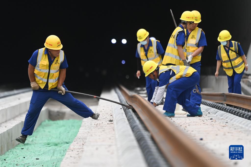 7月20日,中鐵十一局施工人員在杭溫鐵路上進行鋪軌作業。
