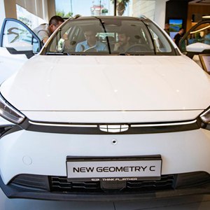 這是6月21日在以色列特拉維夫一家吉利銷售點拍攝的新款幾何C電動車。