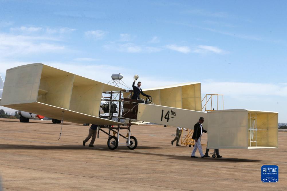 7月20日,在巴西首都巴西利亞舉行的杜蒙特誕辰150周年紀念儀式上,演員扮作飛行先驅桑托斯·杜蒙特站在“14bis”飛行器的復制模型上。