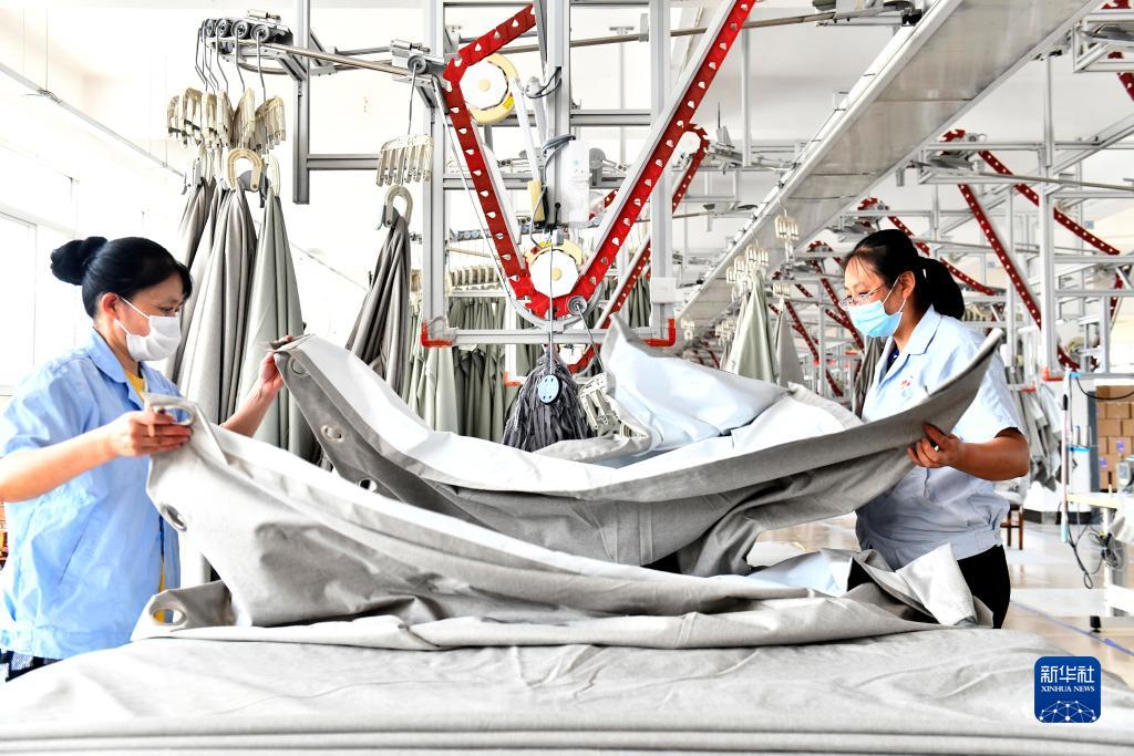 7月21日,在位于威海市文登區的山東銀豐家用紡織品有限公司,工人在加工家紡產品。