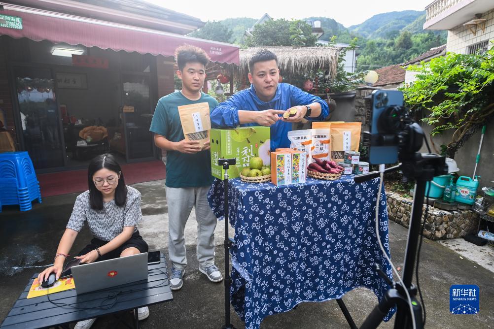 7月21日,在杭州市臨安區高虹鎮崇陽村,何江南(右)和搭檔在直播銷售當地土特產。何江南回鄉后通過短視頻創作加帶貨直播形式,宣傳家鄉美食美景,實現村級土特產銷售和村民收入雙提升。