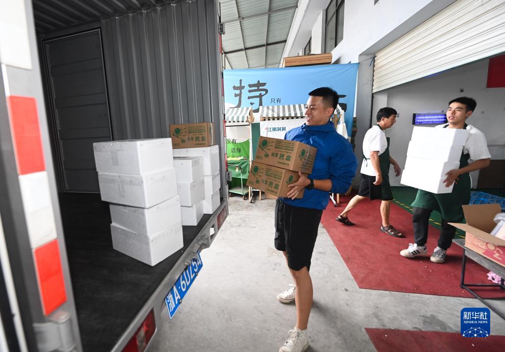 7月21日,在杭州市臨安區高虹鎮崇陽村,返鄉創業的何江南(左)和村民一起裝車發貨。何江南回鄉后通過短視頻創作加帶貨直播形式,宣傳家鄉美食美景,實現村級土特產銷售和村民收入雙提升。