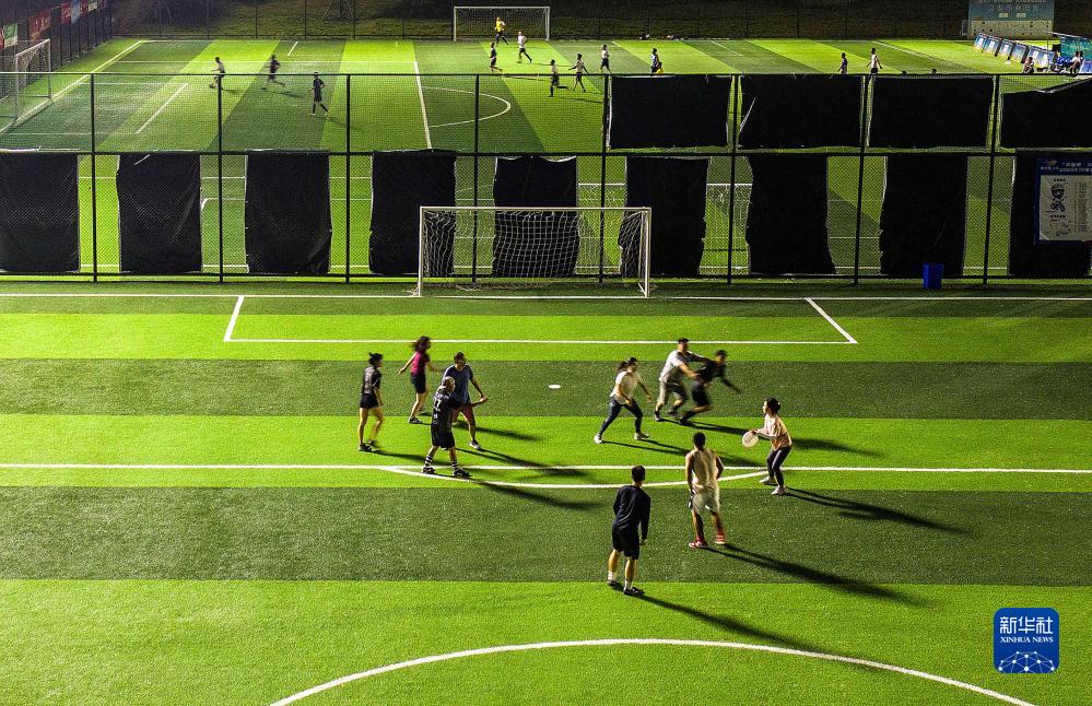 市民在成都市錦江體育公園足球場里玩飛盤(7月13日攝)。