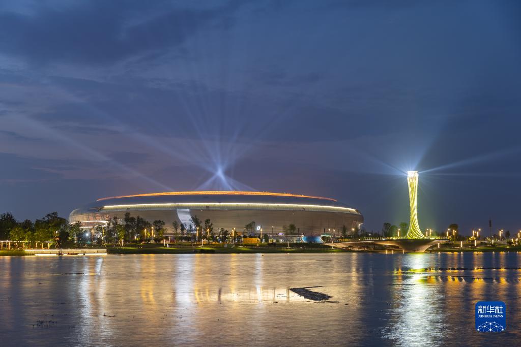 這是在成都市龍泉驛區(qū)拍攝的夜幕下的東安湖體育公園(7月18日攝)。