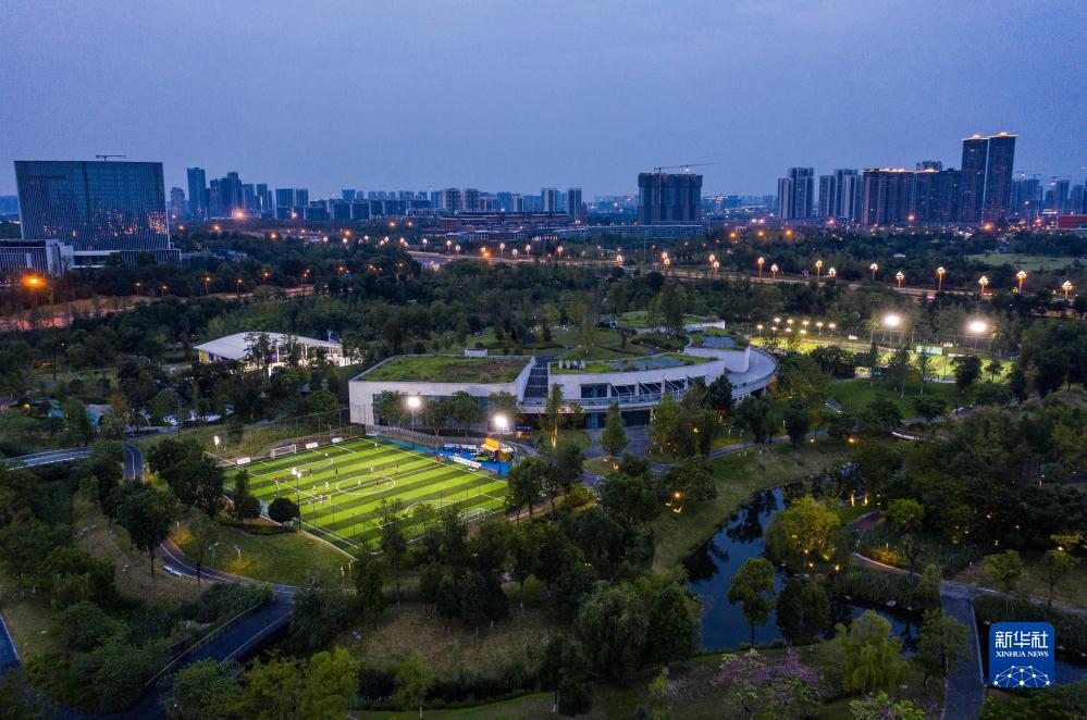 市民在成都天府新區20號足球主題運動公園踢足球(7月13日攝)。