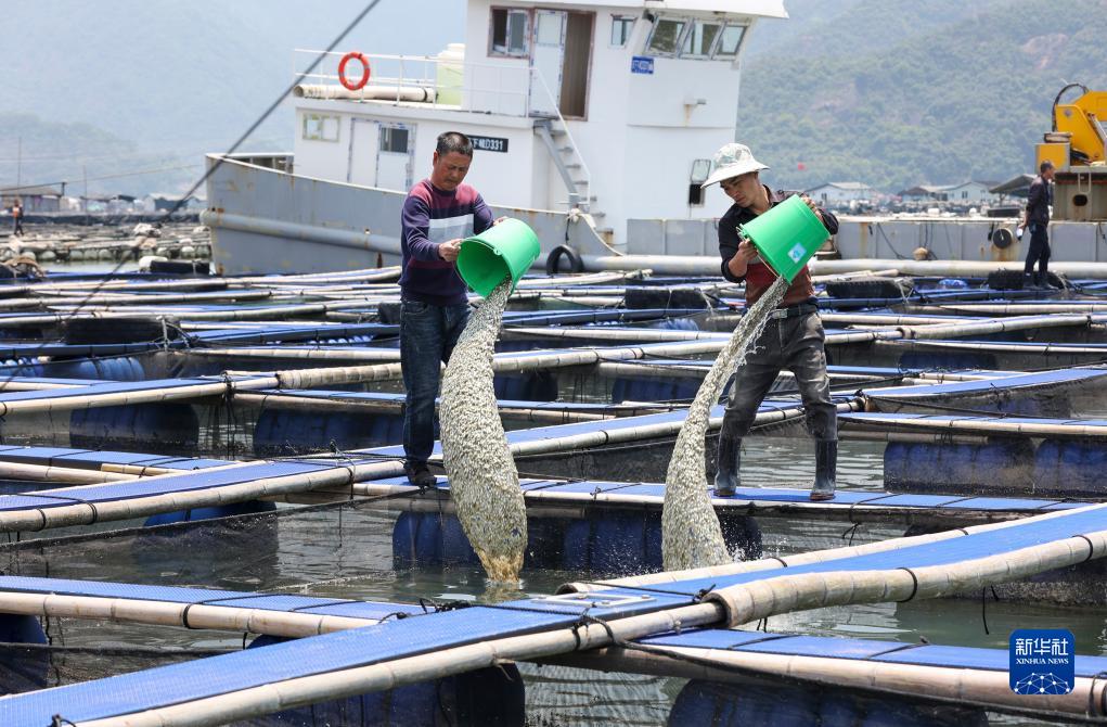 養殖戶在寧德三都澳東沖口海域投放大黃魚魚苗(5月9日攝)。