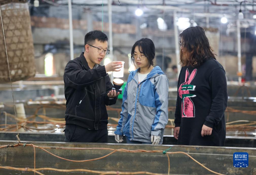 在寧德泩泩漁業育苗場,廈門大學徐鵬教授團隊駐場博士(中、右)向育苗場負責人了解大黃魚實驗苗培養情況(5月9日攝)。一代又一代人的科技接力,讓大黃魚越“游”越強健。
