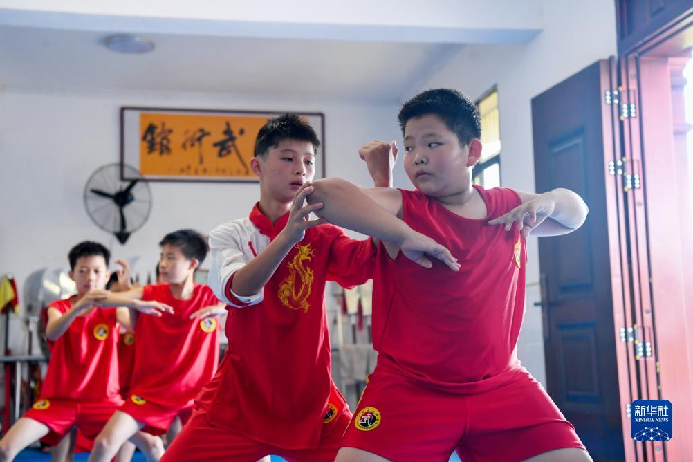 7月21日,在江西省宜春市袁州區(qū)南廟鎮(zhèn)白馬村鄉(xiāng)村武館,孩子們在進(jìn)行武術(shù)套路練習(xí)。