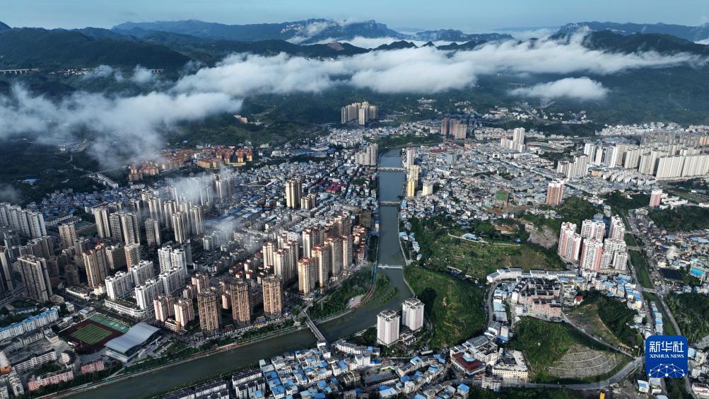 晨曦薄霧下的貴州省銅仁市印江土家族苗族自治縣縣城(無人機照片,7月21日攝)。