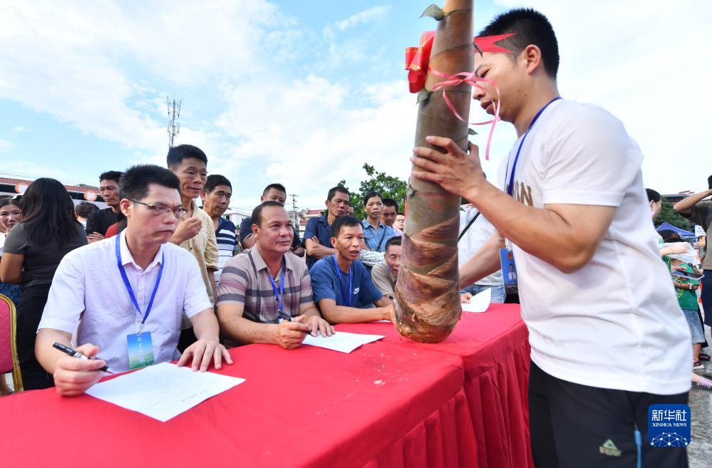 7月21日,在柳州市柳城縣“筍王”爭霸賽現場,評委給參賽竹筍評分。