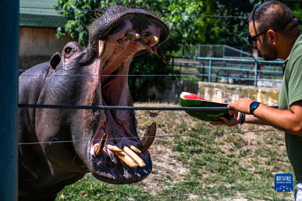 7月18日,在北馬其頓首都斯科普里一家動(dòng)物園,飼養(yǎng)員給河馬投喂西瓜。