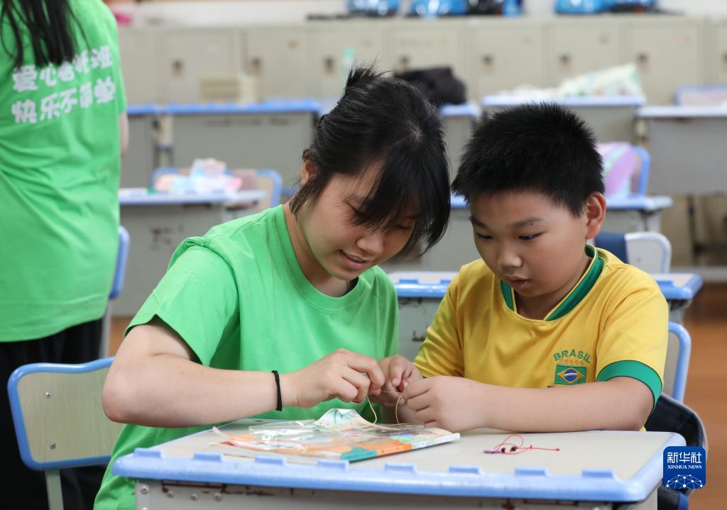 7月21日,在萬里城實驗學校,小學生愛心暑托班“新業態新就業群體子女專班”的孩子們在志愿者的指導下學習編繩。
