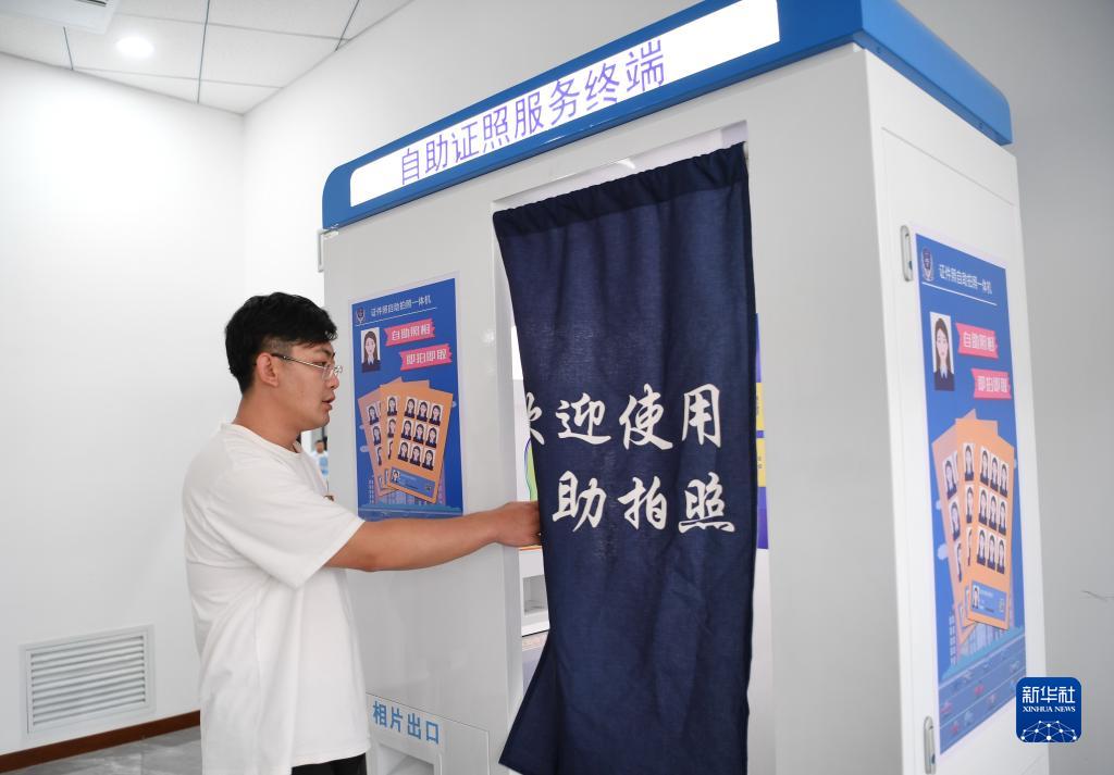 7月22日,市民在河北省灤州市政務服務中心內準備使用自助拍照設備拍攝證件照片。