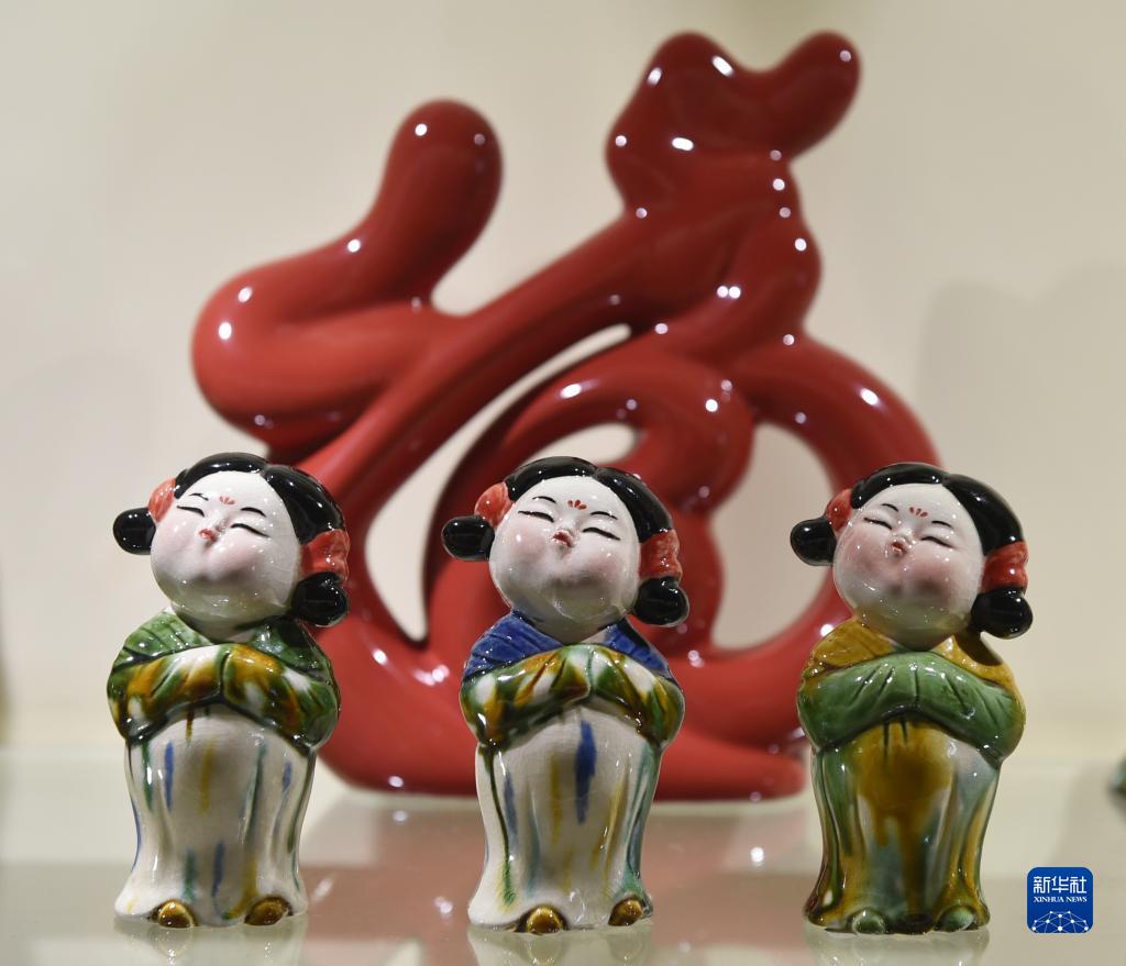 這是7月19日在南石山村一家生產(chǎn)企業(yè)的展廳里拍攝的唐三彩作品。