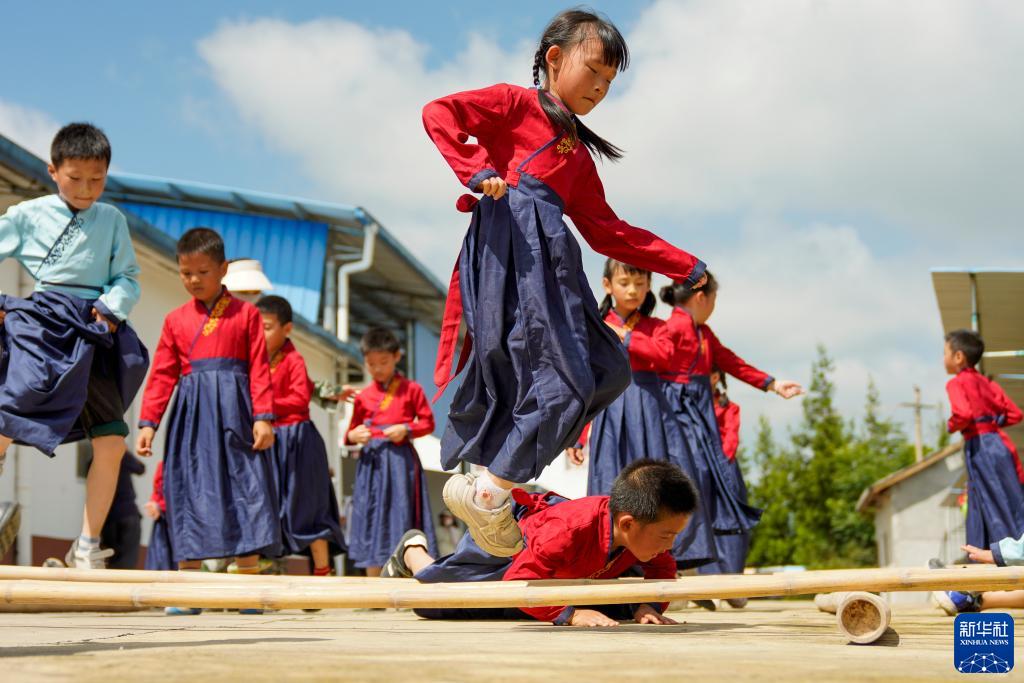 7月22日,萬州區恒合土家族鄉一個研學基地內,參加暑期避暑研學活動的學生在練習傳統體育運動跳竹竿。