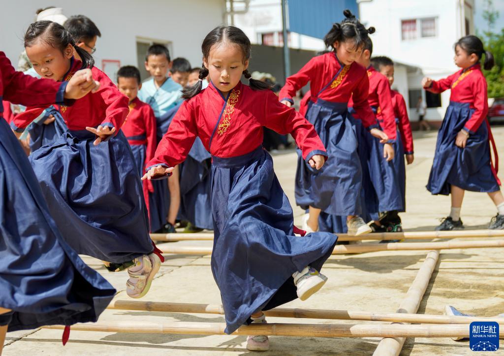 7月22日,萬(wàn)州區(qū)恒合土家族鄉(xiāng)一個(gè)研學(xué)基地內(nèi),參加暑期避暑研學(xué)活動(dòng)的學(xué)生在練習(xí)傳統(tǒng)體育運(yùn)動(dòng)跳竹竿。