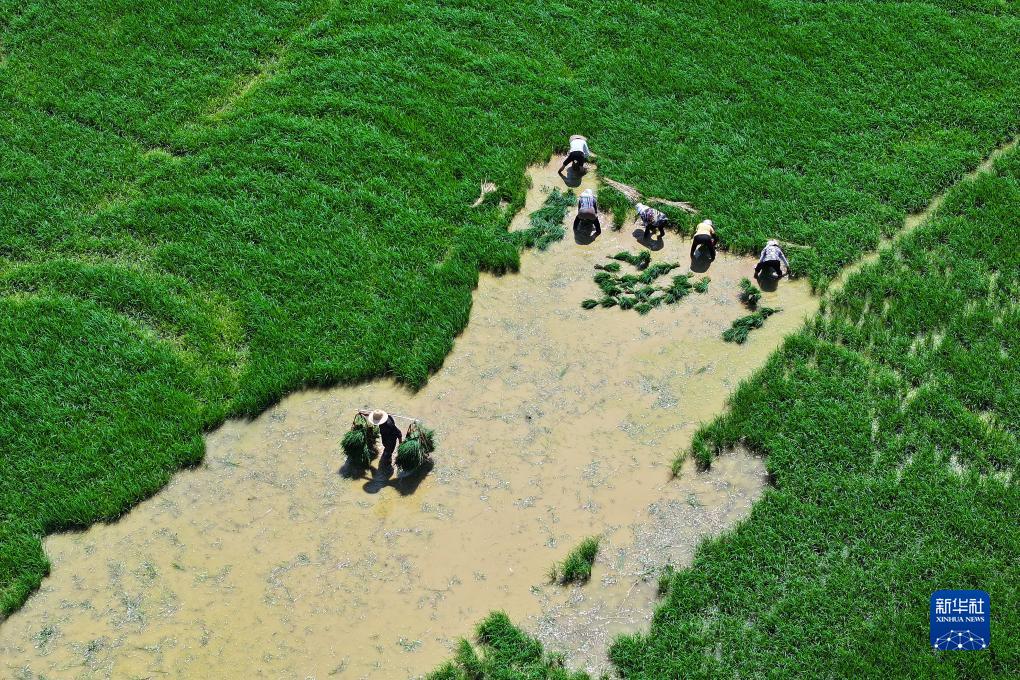 7月22日,湖南省衡陽市衡東縣高湖鎮(zhèn),村民為晚稻起秧(無人機照片)。