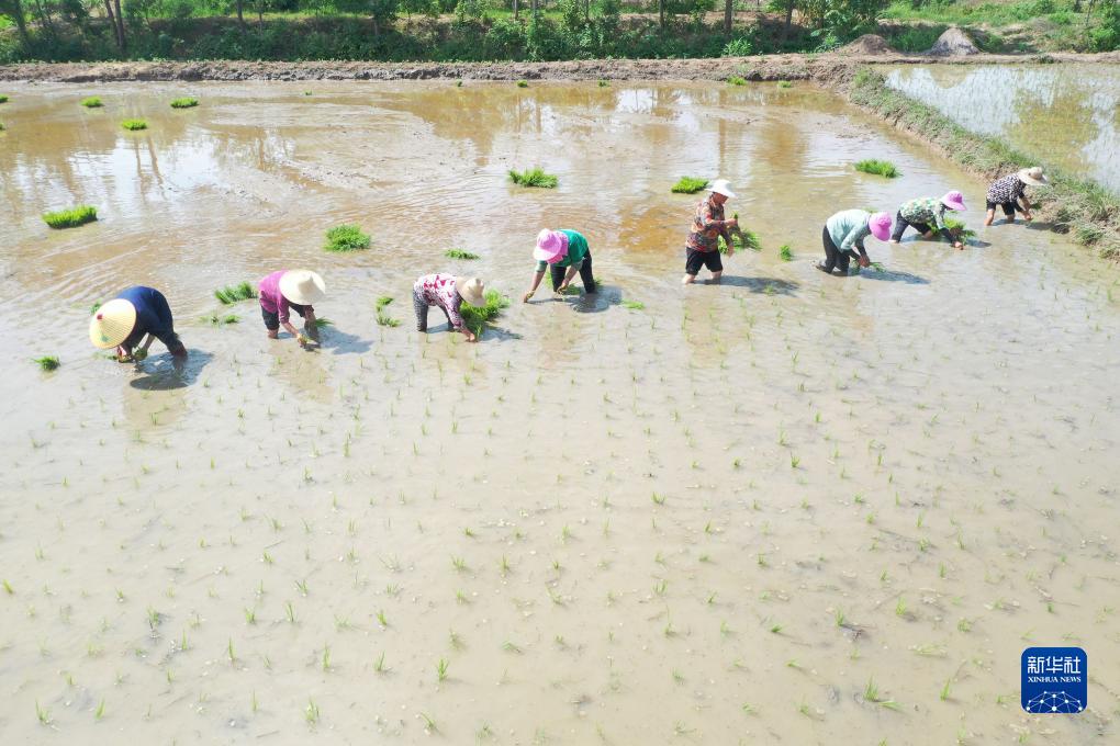 7月22日,在湖南省常德市澧縣金羅鎮草堰村,村民搶插晚稻秧苗(無人機照片)。