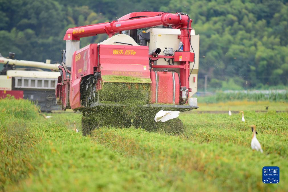 7月22日,在浙江省寧波市鄞州區(qū)橫溪鎮(zhèn)孔家譚,農民駕駛農機收割早稻。