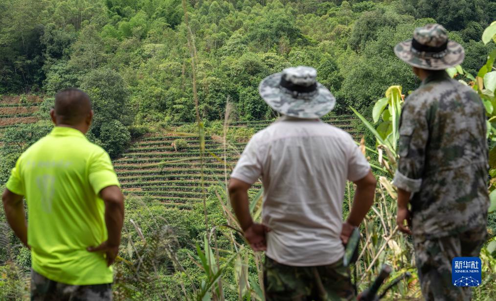 7月20日,刁發興(左)看著遠處的一頭亞洲象。