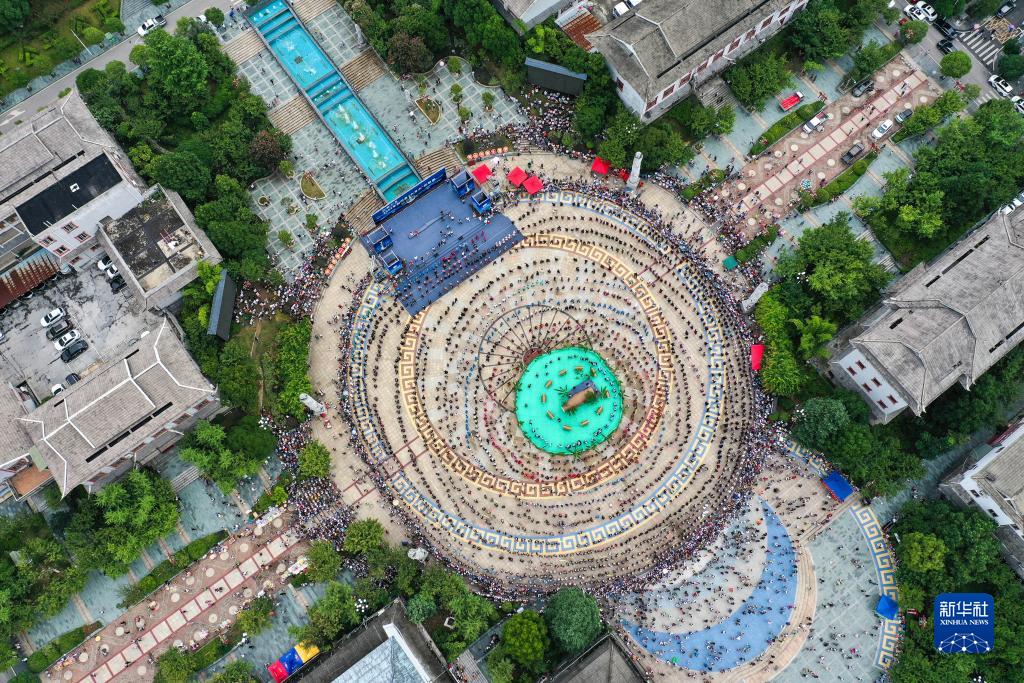 7月23日,人們在貴州劍河仰阿莎文化節上跳苗族水鼓舞(無人機拍攝)。