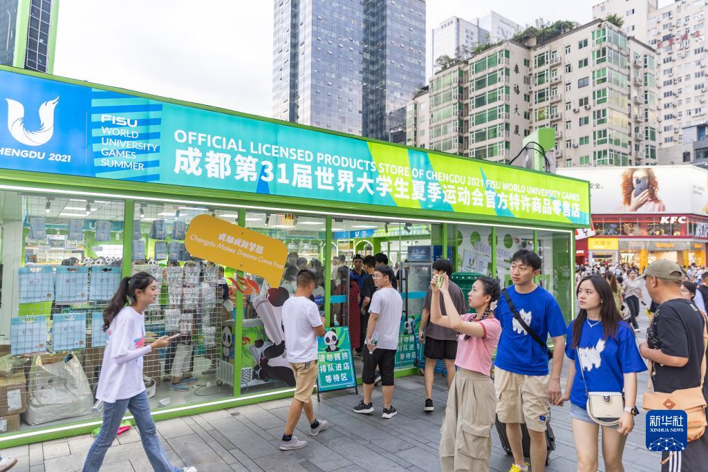 7月19日,在成都市春熙路步行街,人們在大運會官方特許商品零售店前駐足。