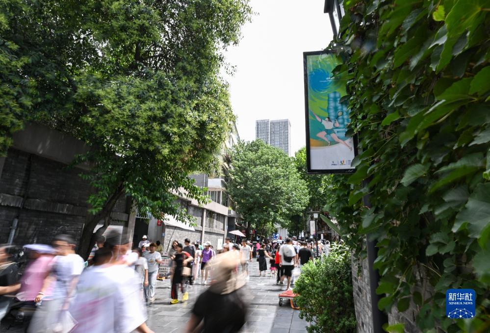 這是7月14日在成都寬窄巷子景區拍攝的迎大運主題標識牌。