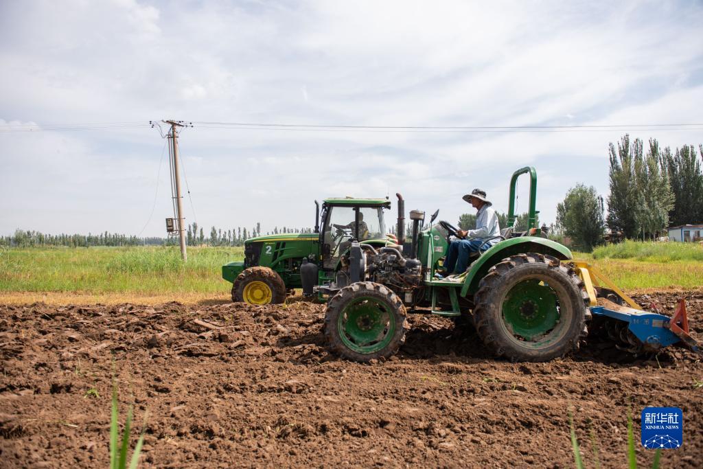 7月23日,在寧夏青銅峽市蔣南村,農(nóng)民操作機(jī)械在田間作業(yè)。