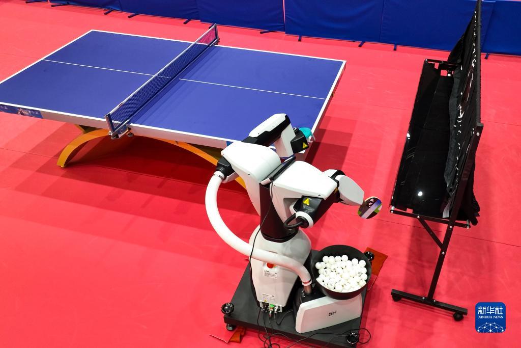 這是7月22日在成都高新體育中心多功能館拍攝的乒乓球訓練機器人。該設備通過模擬人體動作發球,方便接球者對發球動作進行觀察和預判。同時可以自定義發球的速度、旋轉和落點,針對訓練需求設定多種打法的訓練動作體系,幫助運動員高效精準調整訓練。