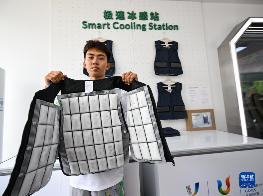 7月15日,在大運村科技服務工作站,工作人員在展示降溫冰背心。