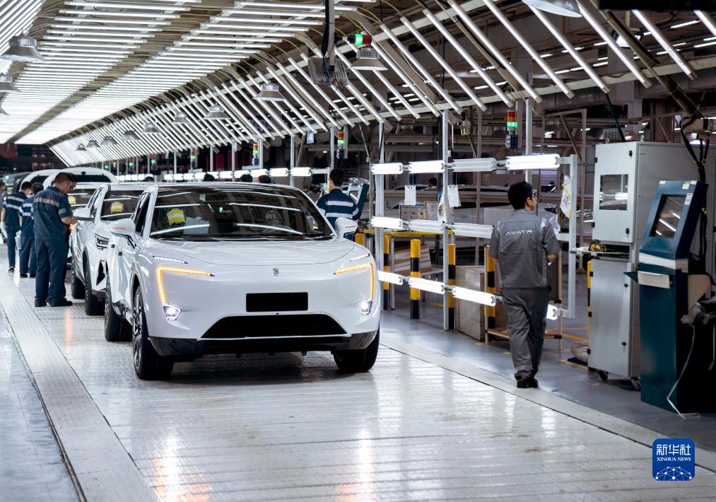 7月20日,在位于重慶市江北區(qū)的長(zhǎng)安汽車生產(chǎn)基地車間內(nèi),工作人員在新能源汽車阿維塔生產(chǎn)線上作業(yè)。