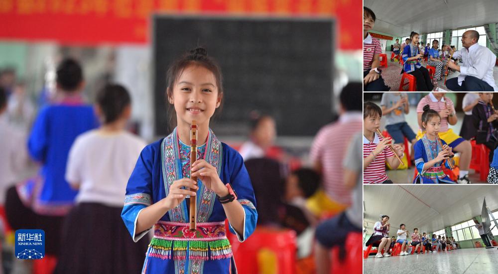 拼版照片:左圖為廣西三江侗族自治縣10歲的小學(xué)生石金晶;右圖為石金晶在縣文化館非遺公益培訓(xùn)班上學(xué)習(xí)吹侗笛(照片均攝于7月13日)。暑假期間,三江侗族自治縣文化館舉辦侗笛公益培訓(xùn)班,喜歡吹奏侗族樂器的石金晶報(bào)名參加。