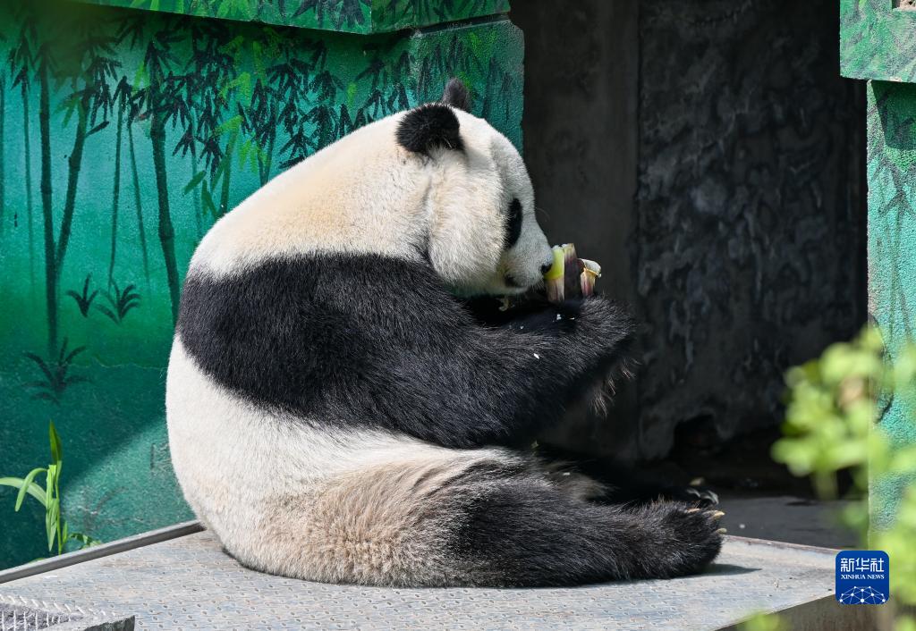 7月24日,在天津動物園熊貓館,大熊貓“喜樂”在吃竹筍。