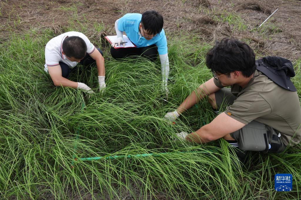 7月9日,中國科學院洞庭湖濕地生態(tài)系統(tǒng)觀測研究站科研人員鄒業(yè)愛博士(左)和學生在湖南東洞庭湖國家級自然保護區(qū)采集苔草樣本。新華社記者 金立旺 攝