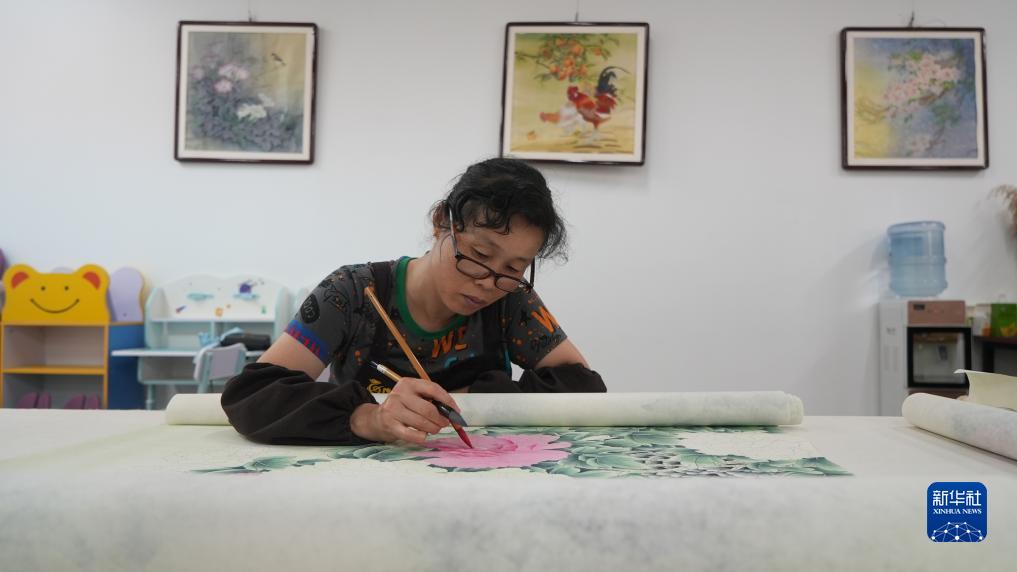7月24日,畫師在山東省巨野縣書畫院繪制工筆畫作品。
