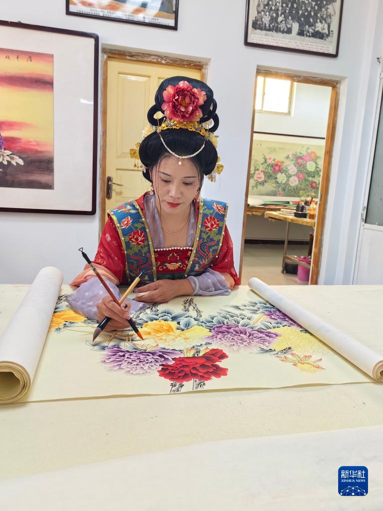 7月24日,畫師在山東省巨野縣永豐街道辦事處洪廟村鄉(xiāng)村畫院繪制工筆畫作品。