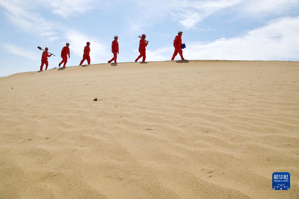 巡線隊員在巡線時穿越沙漠區域(7月23日攝)。