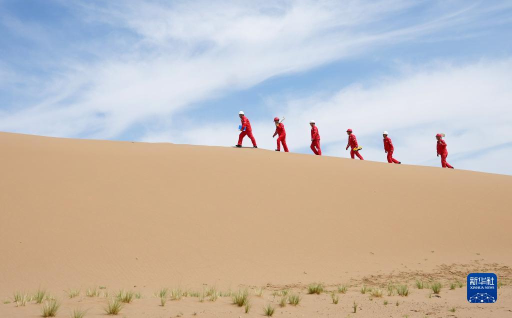 巡線隊員在巡線時穿越沙漠區域(7月23日攝)。