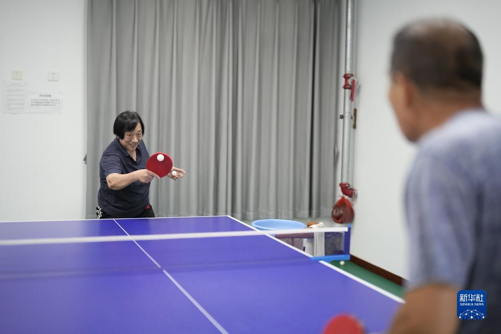 7月25日,老年人在河北省唐山市路北區煤研分院社區養老服務中心打乒乓球。